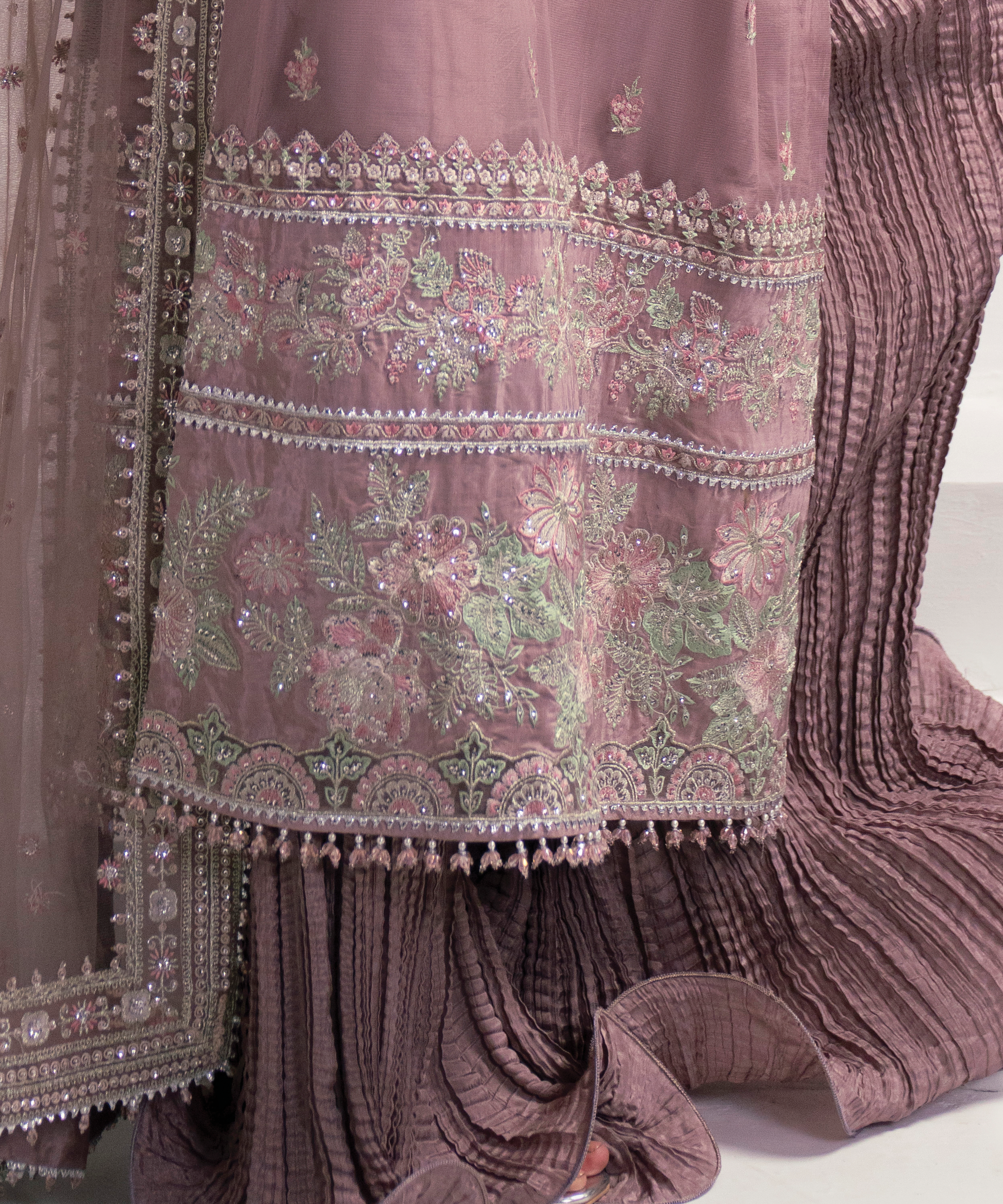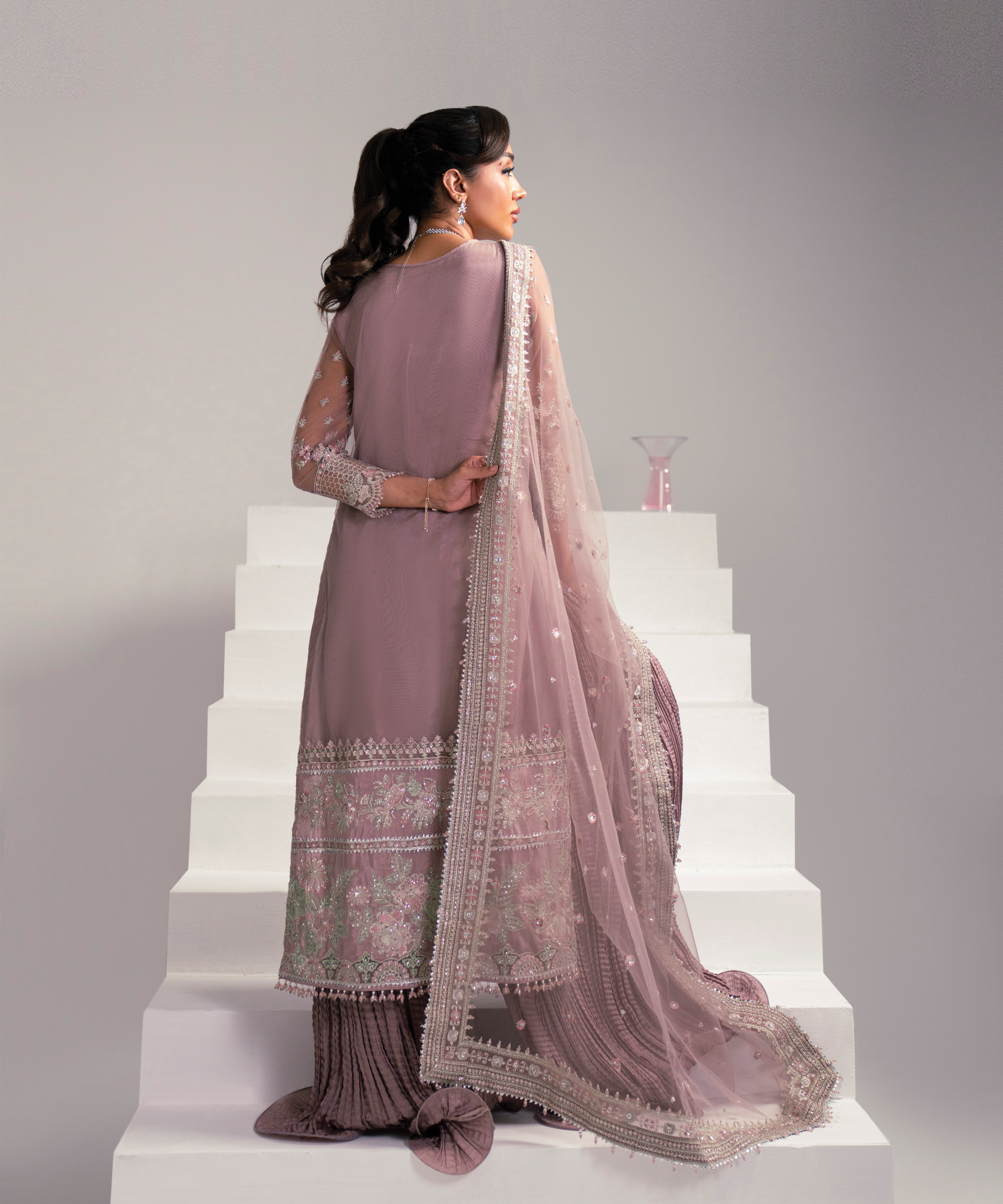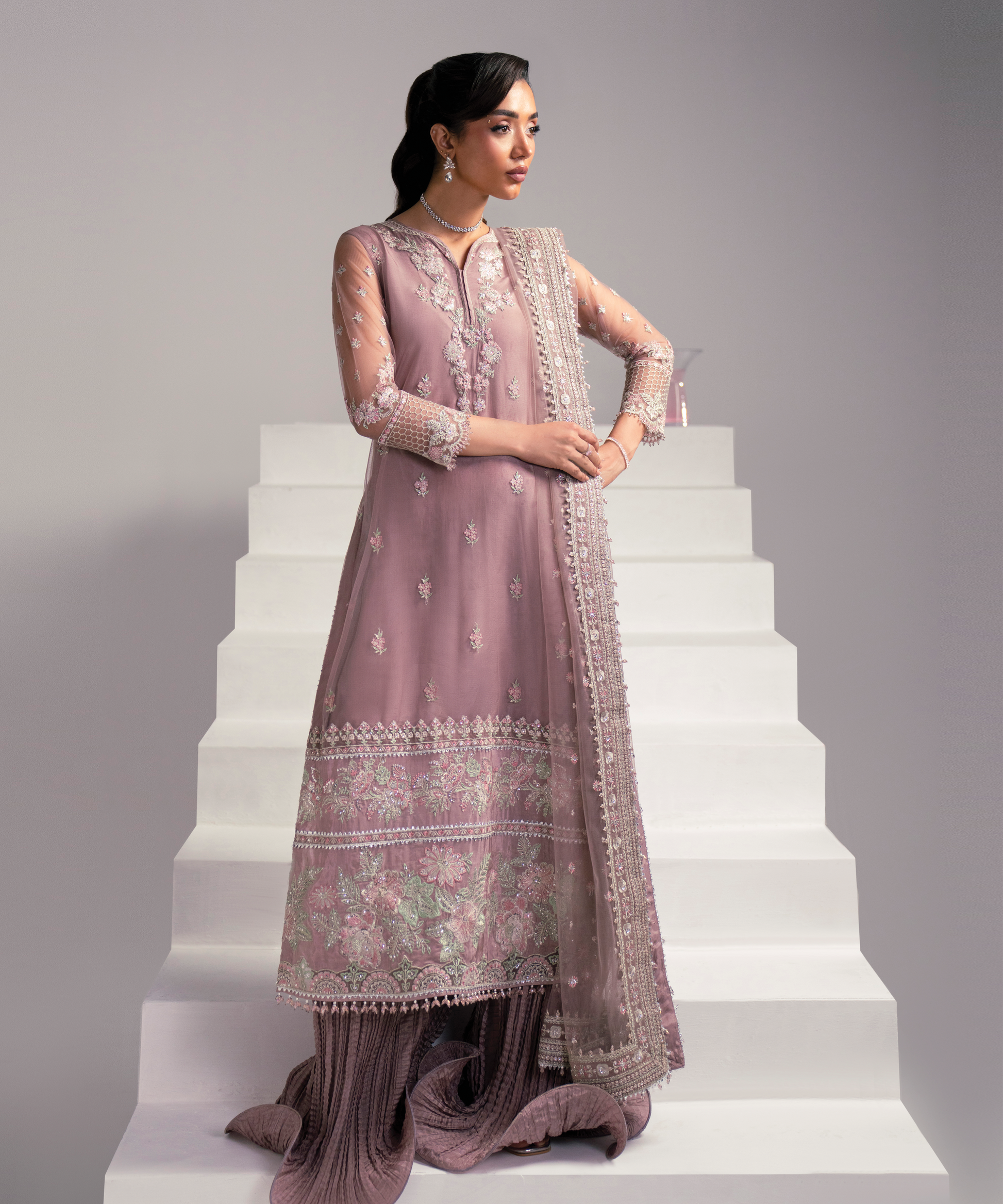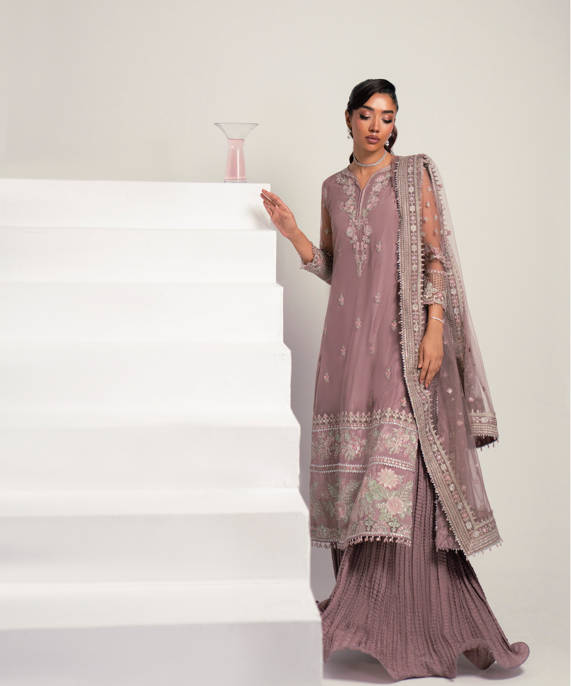 A heavily embroidered formal net outfit in a graceful lilac hue, designed to make you stand out at weddings and festive celebrations. Featuring exquisite embroidery on net fabric paired with a luxurious crush silk sharara, this ensemble combines timeless elegance with modern sophistication.