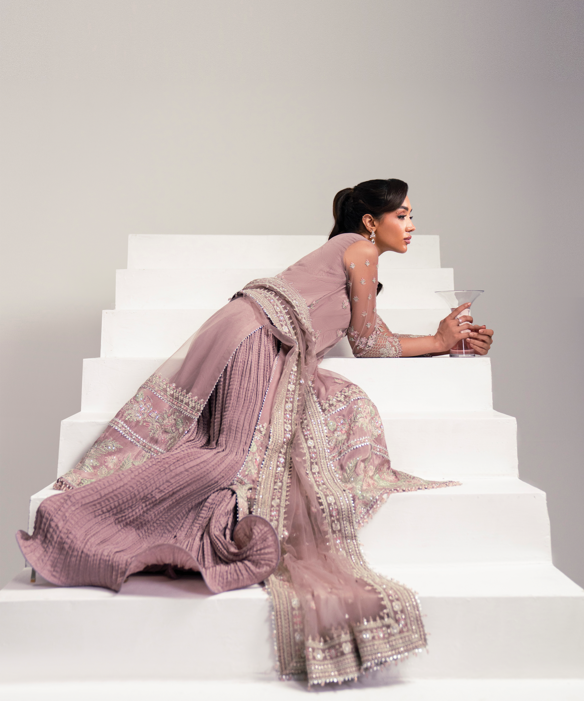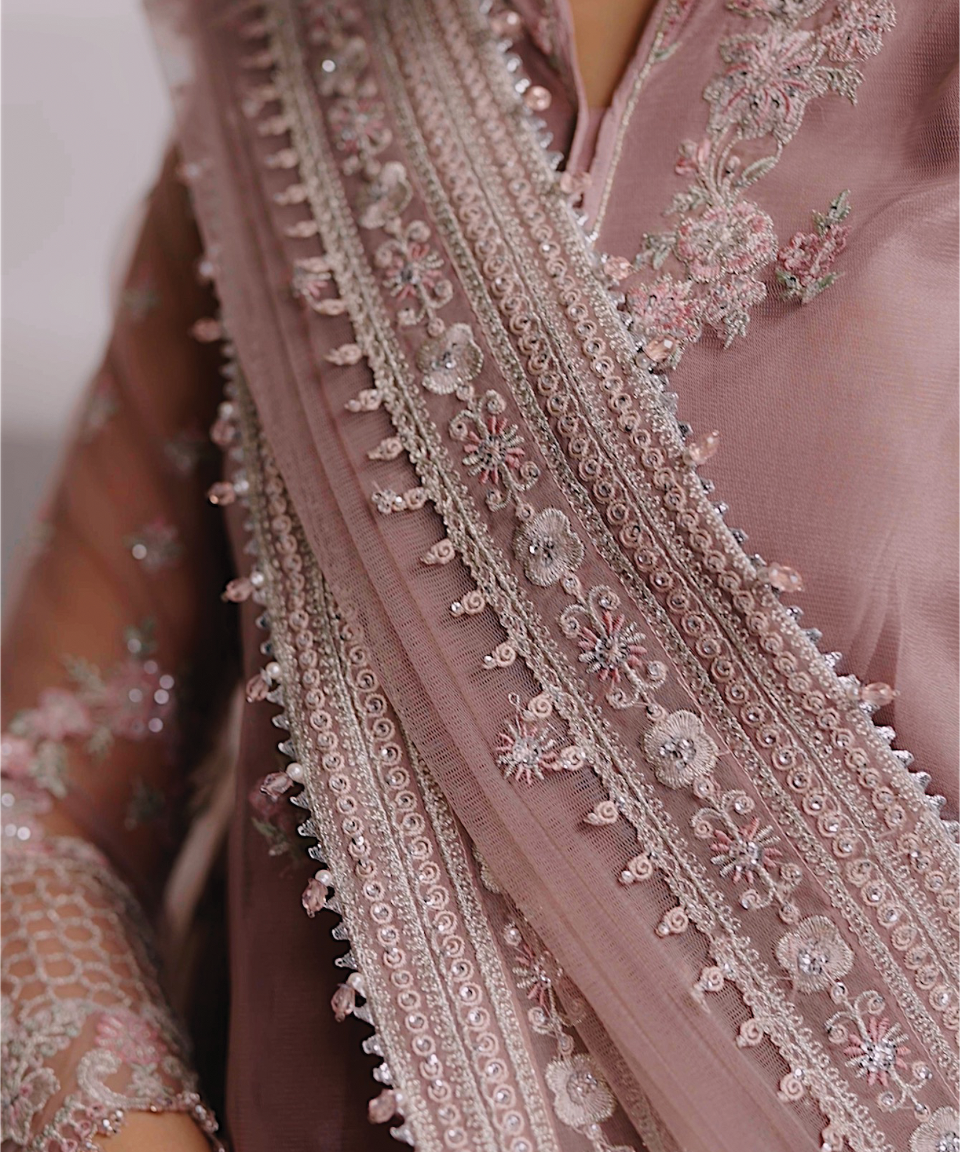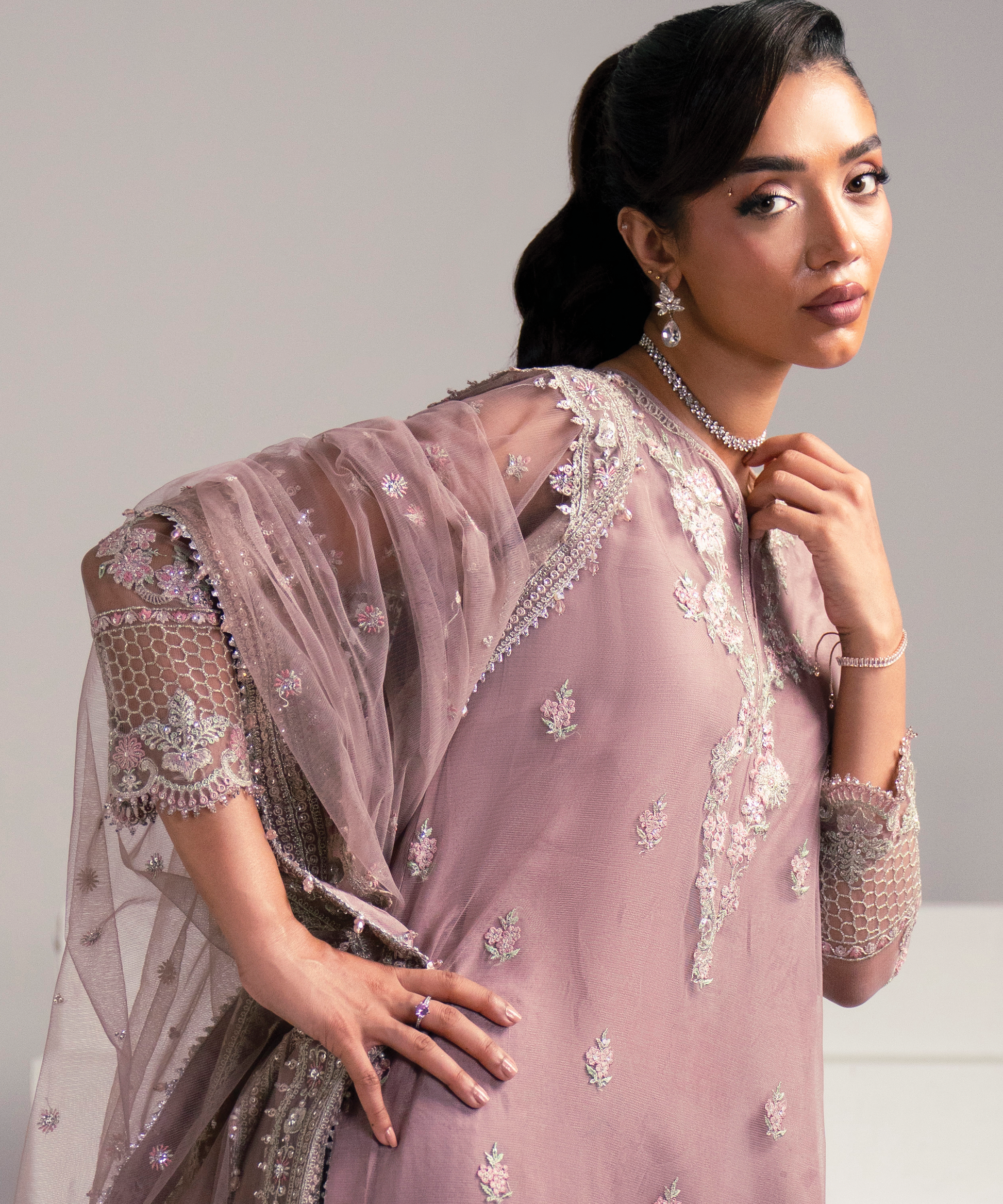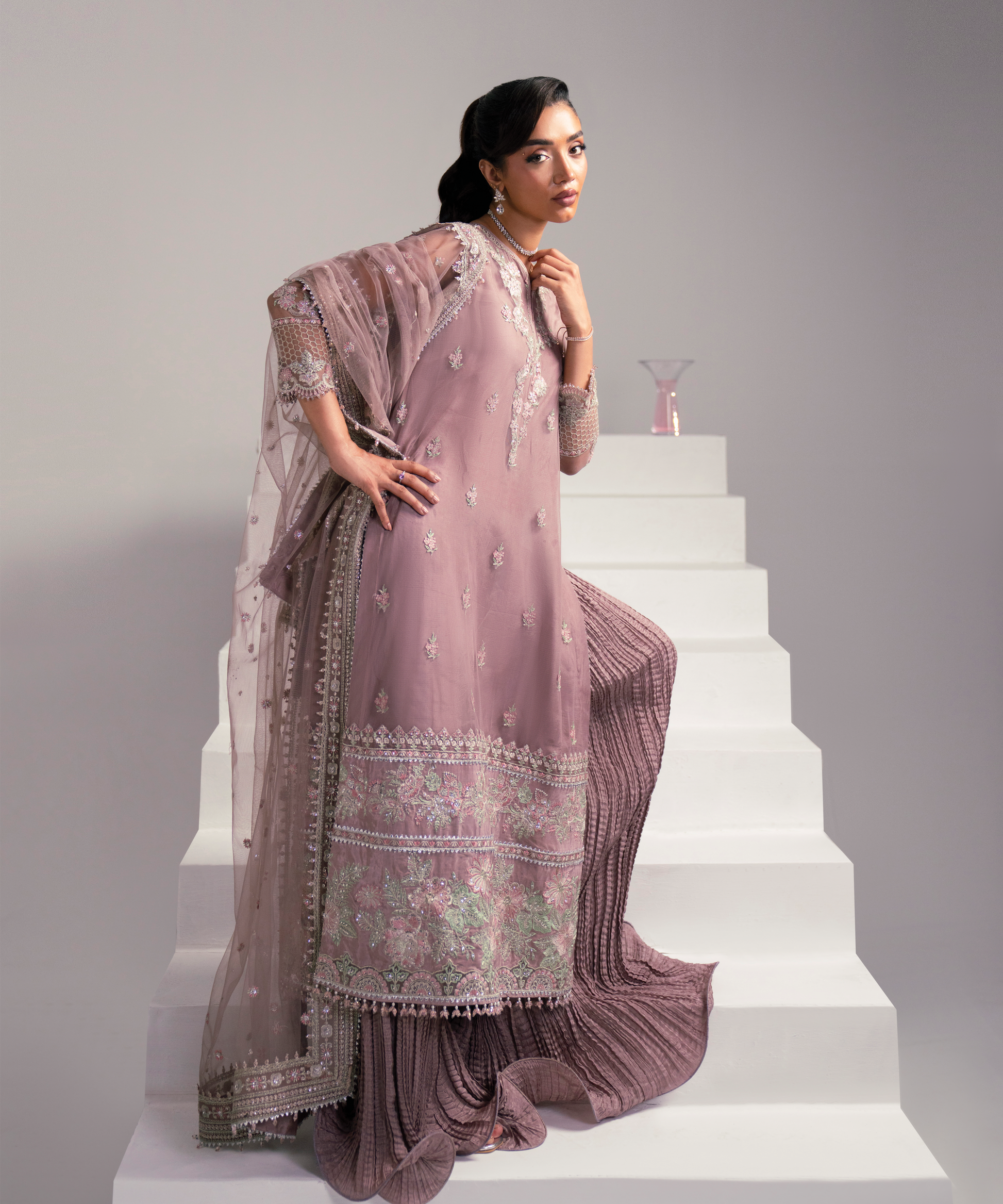 A heavily embroidered formal net outfit in a graceful lilac hue, designed to make you stand out at weddings and festive celebrations. Featuring exquisite embroidery on net fabric paired with a luxurious crush silk sharara, this ensemble combines timeless elegance with modern sophistication.