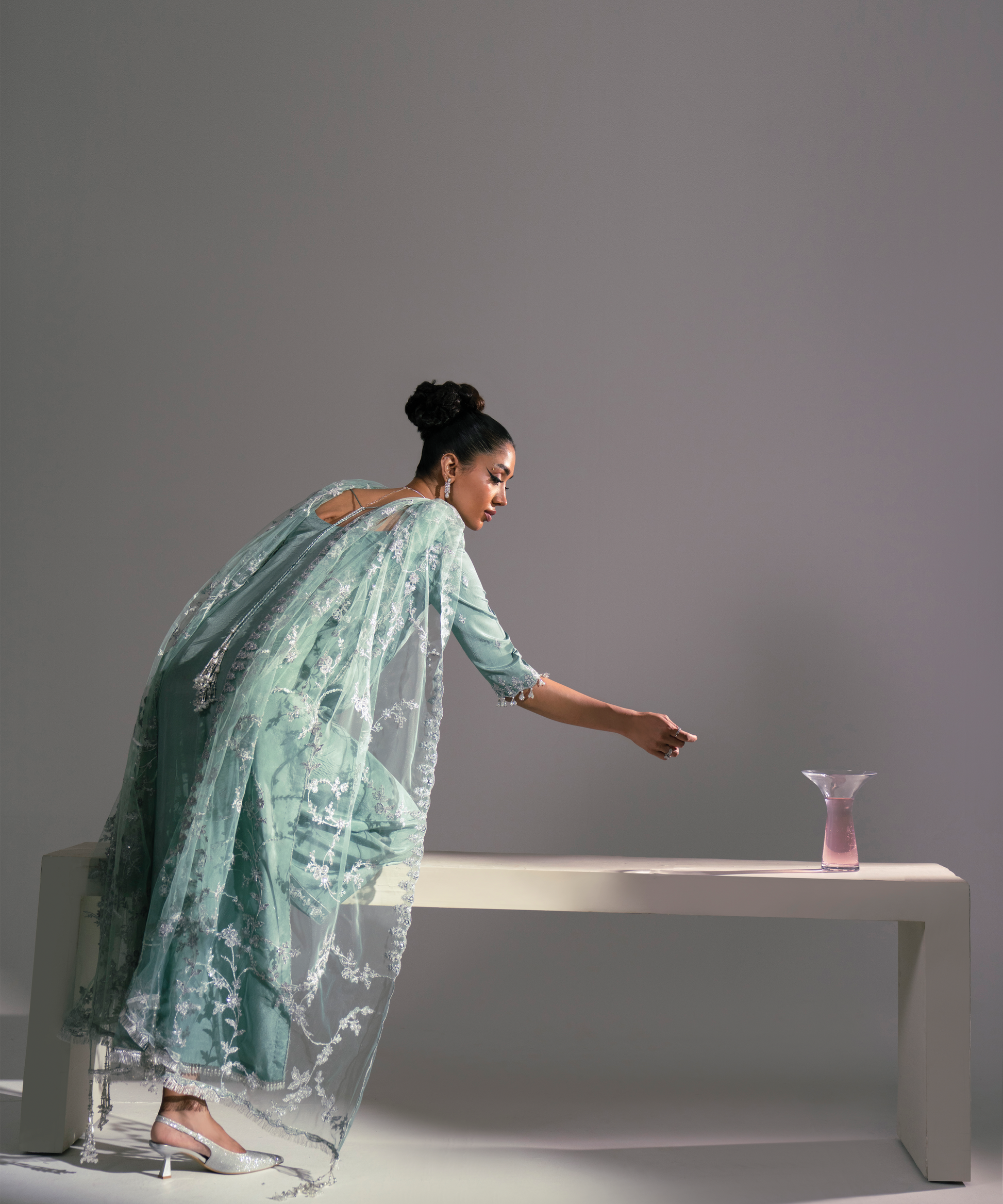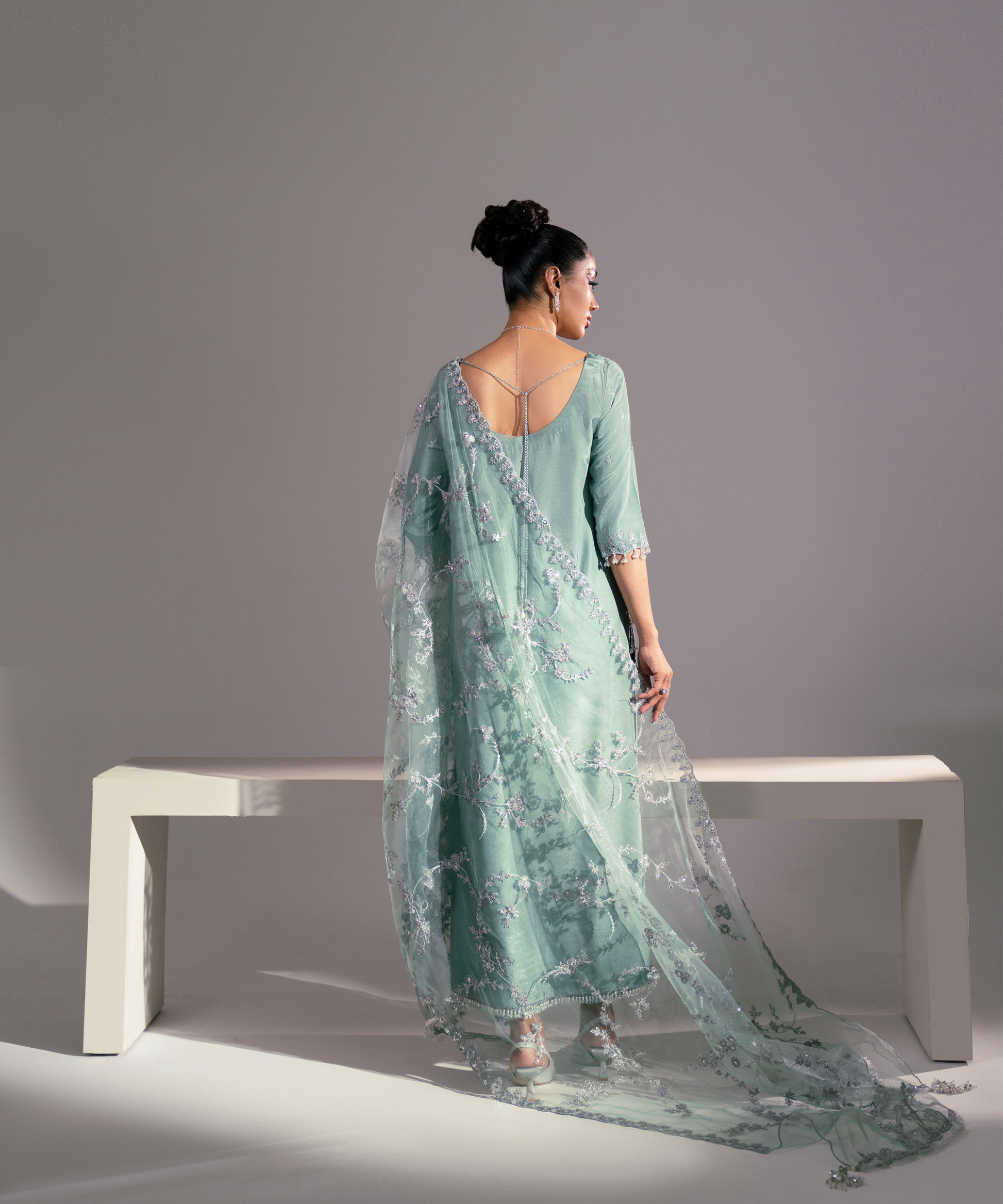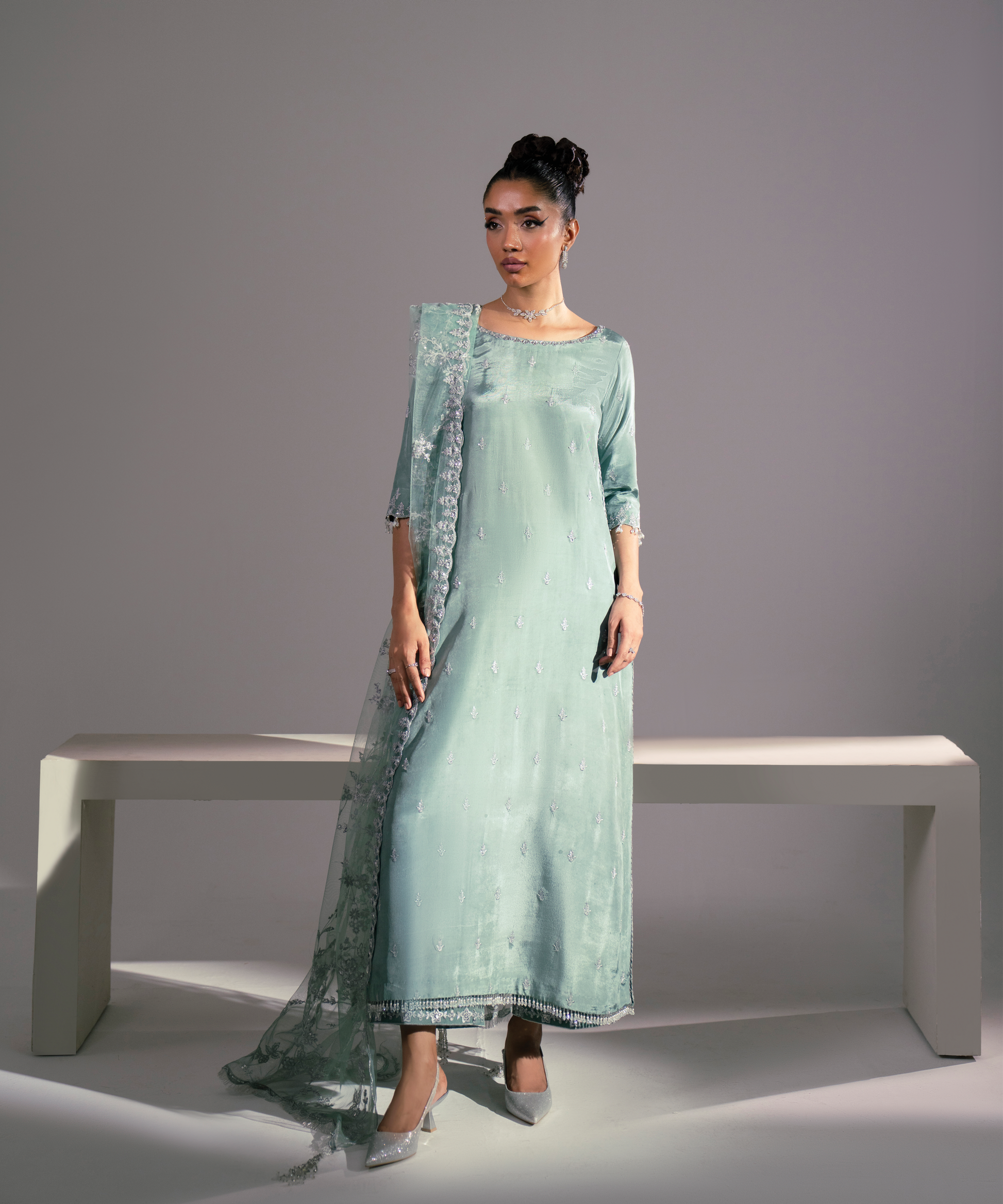 A minimal yet classy silk design in a soft pale turquoise hue, perfect for those who love understated elegance. Crafted from luxurious, soft silk fabric, this outfit features delicate embroidery and ADDA work on the neckline, offering an effortlessly beautiful look suitable for both festive and formal occasions.