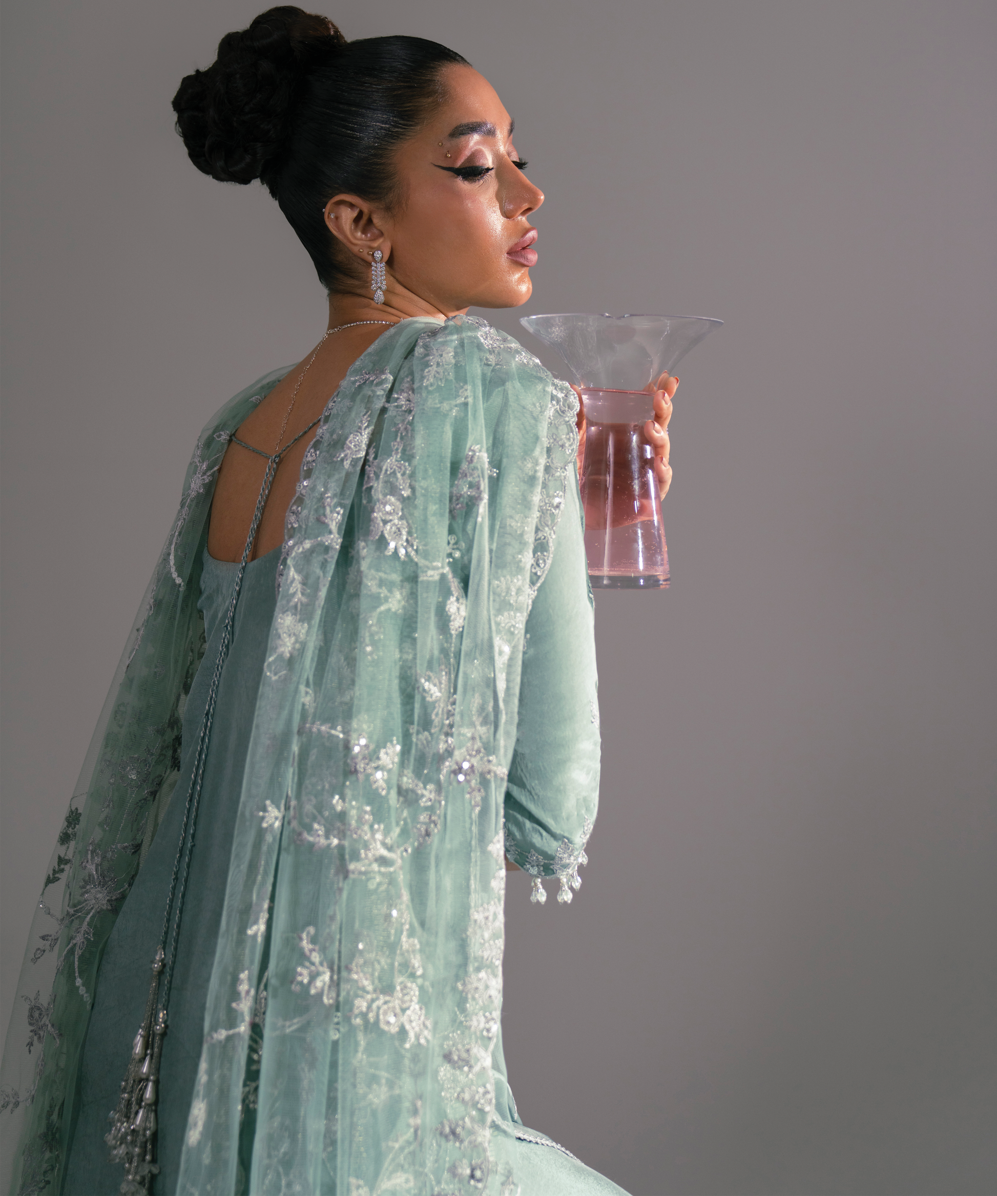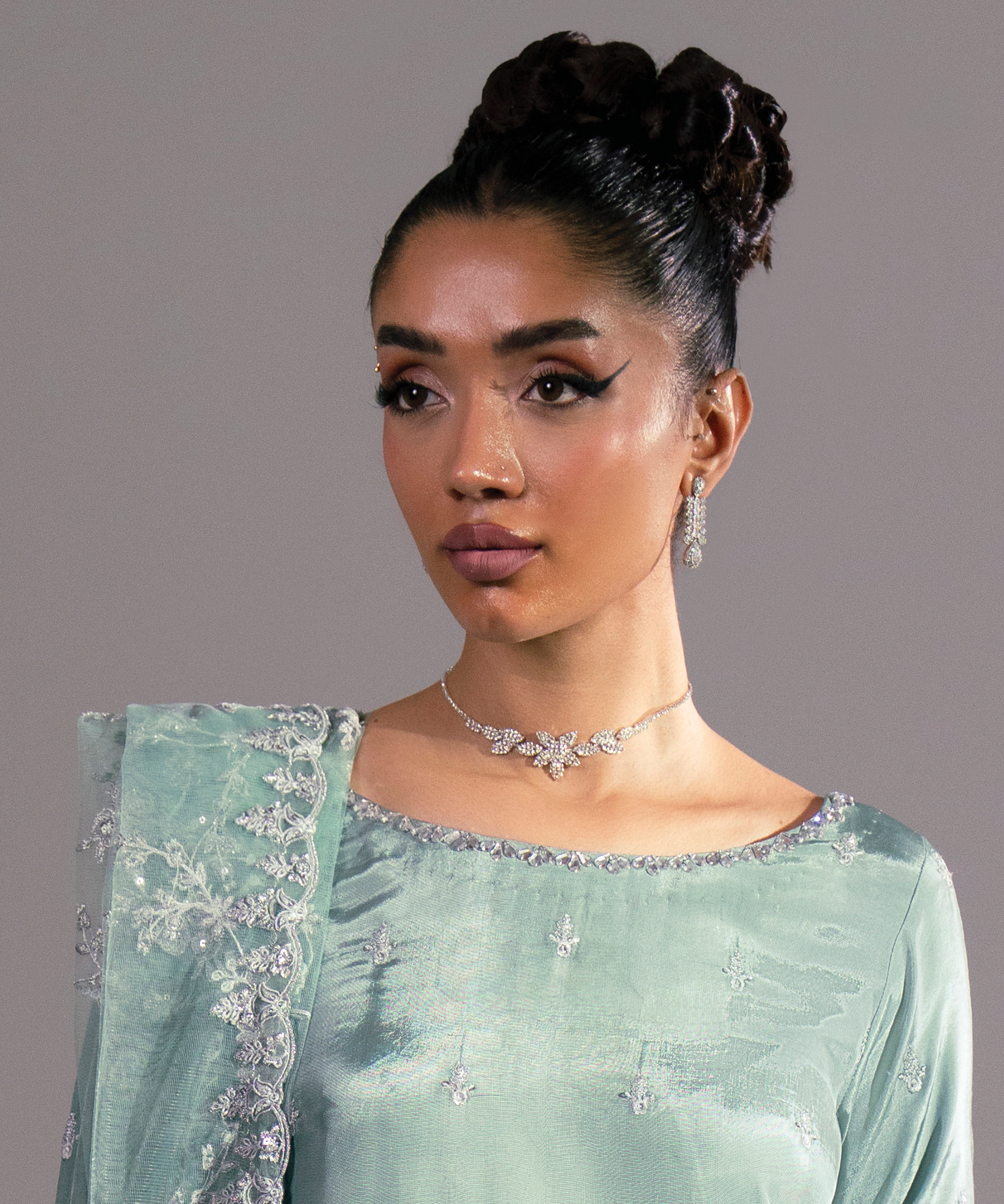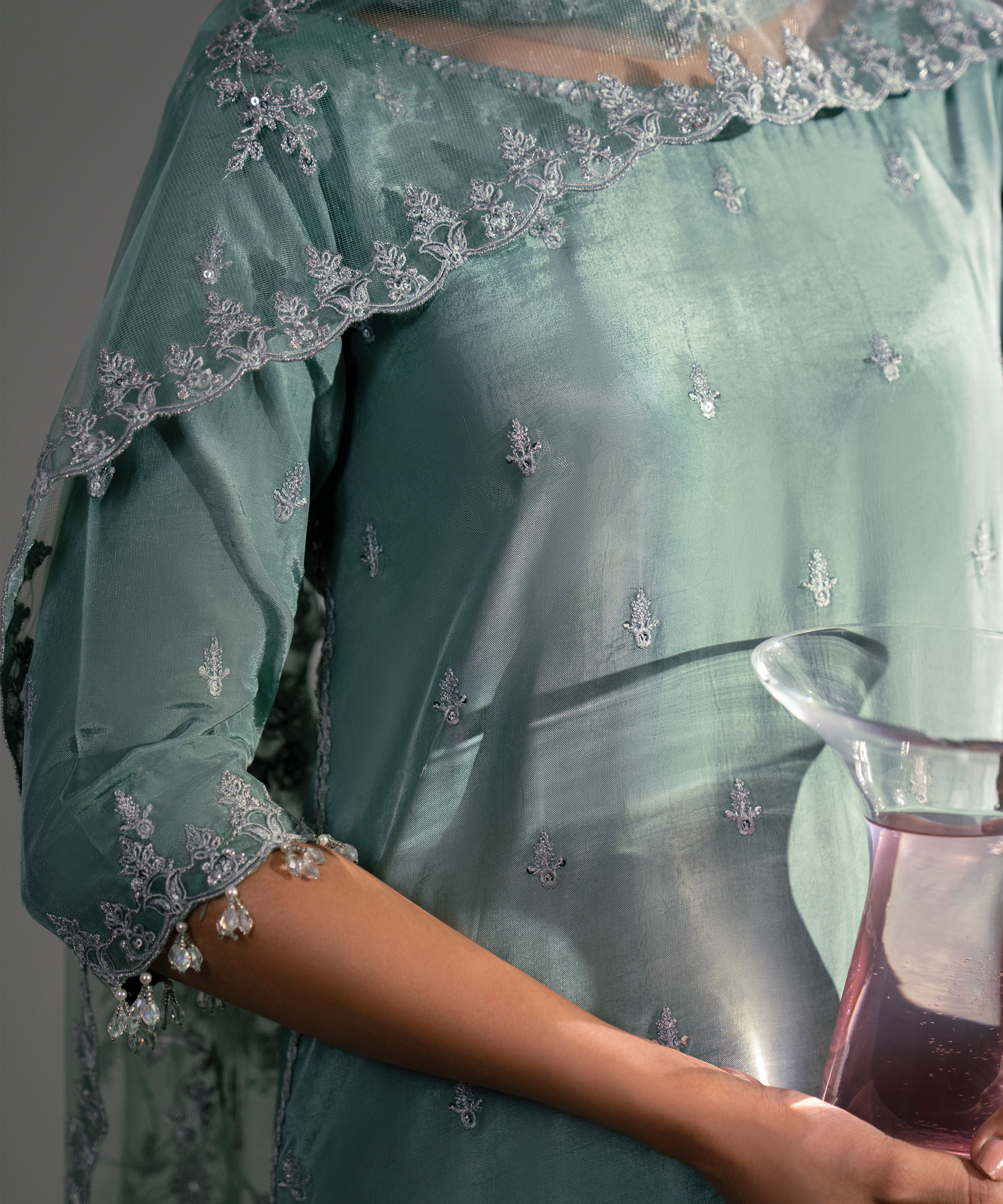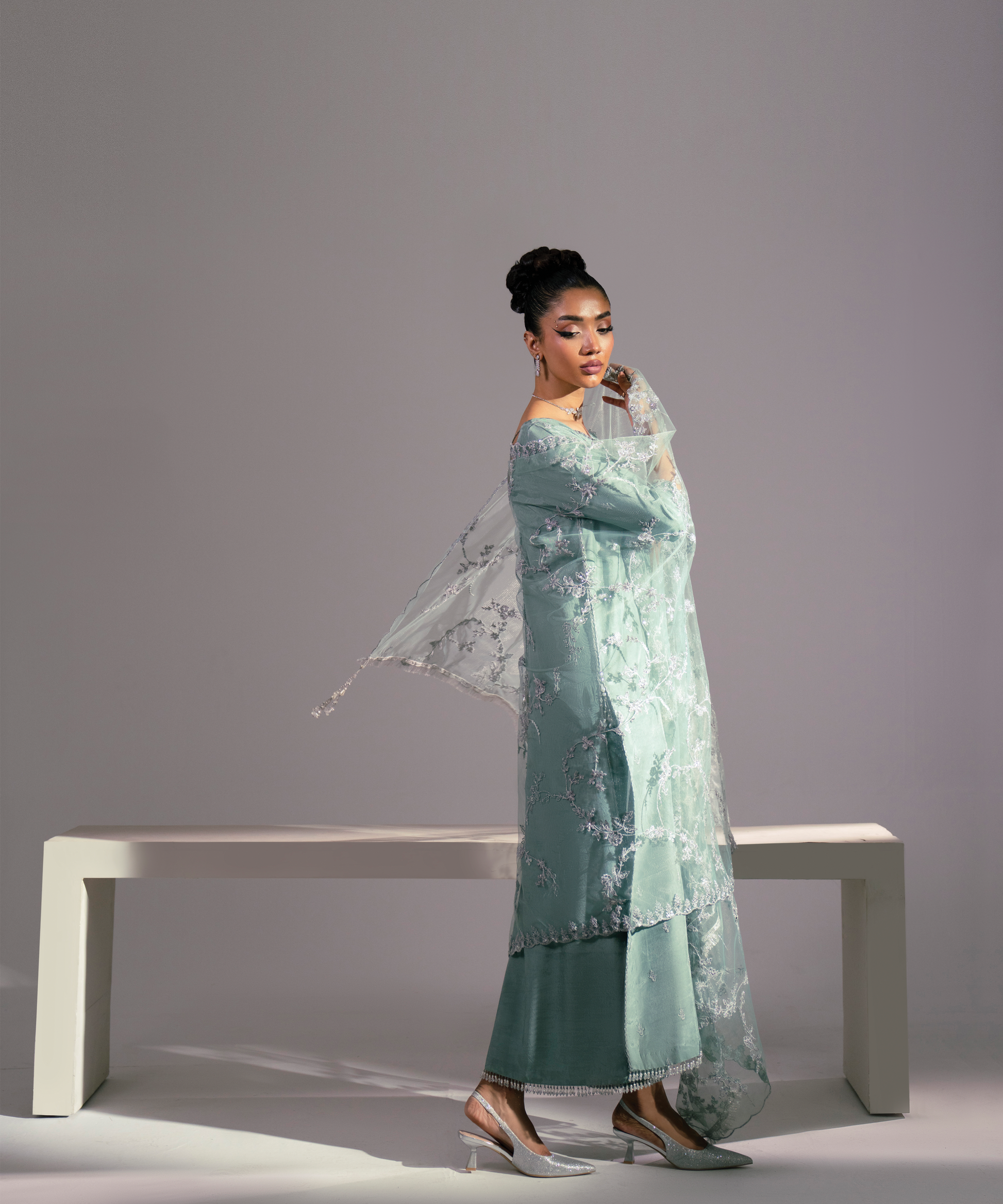 A minimal yet classy silk design in a soft pale turquoise hue, perfect for those who love understated elegance. Crafted from luxurious, soft silk fabric, this outfit features delicate embroidery and ADDA work on the neckline, offering an effortlessly beautiful look suitable for both festive and formal occasions.
